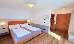 Camera per Famiglia, con divano letto trasformabile in letto a castello, 3 o 4 posti letto, con balcone al primo e seondo piano di 16 m², vista Catena dei Monzoni, wi-fi, bagno privato con doccia, bidet e asciugacapelli, cassaforte, telefono, tv led a 32'', presa USB per ricaricare telefonini, notebook, pad.